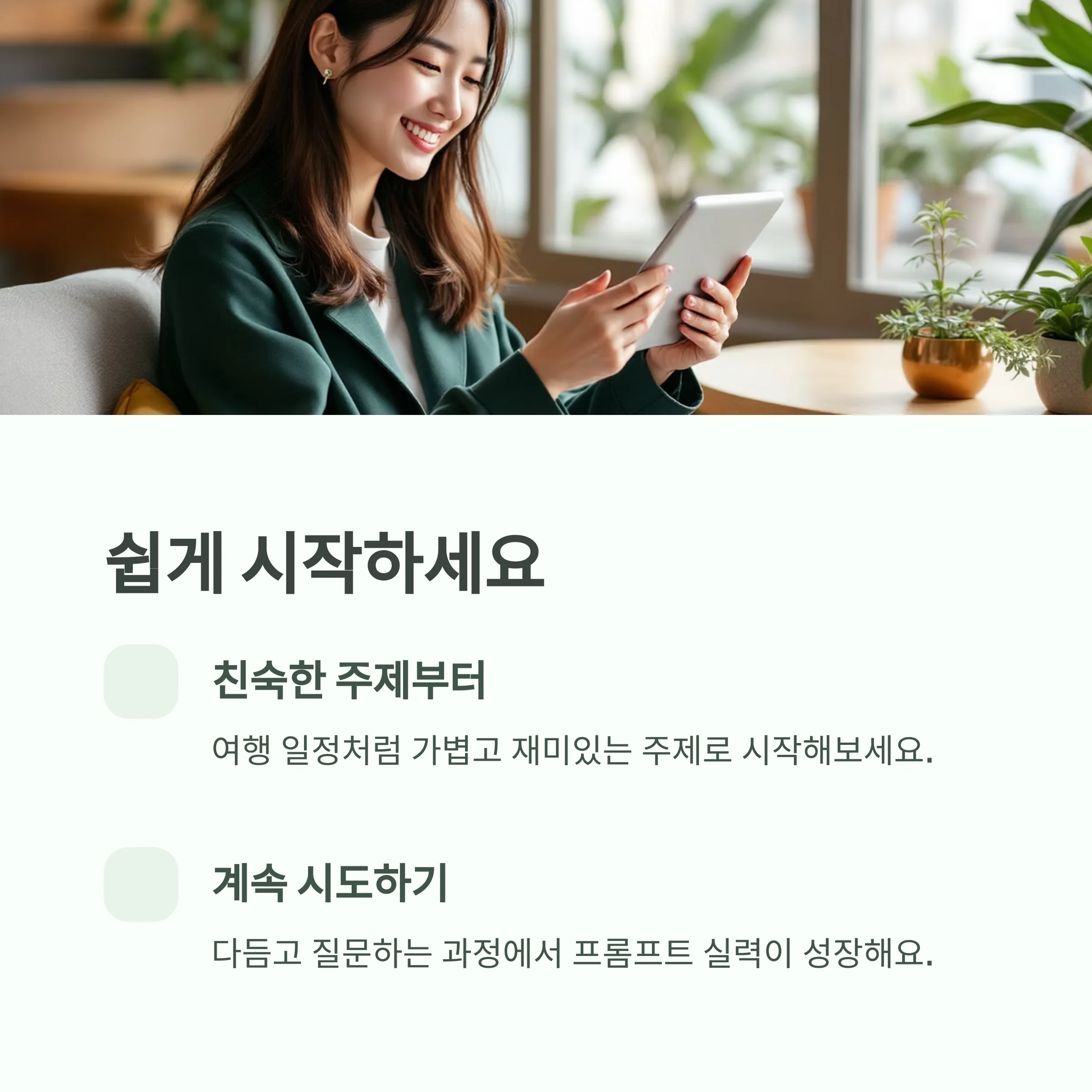 GPT를 처음 접한다면 여행 일정 짜기처럼 가볍고 친숙한 주제부터 시작해보세요. 간단한 프롬프트 하나로도 놀라운 결과가 나올 수 있어요. 그리고 계속 시도하고, 다듬고, 질문하는 과정 속에서 프롬프트 실력은 자연스럽게 성장합니다. 처음이 어렵다면 오늘 소개한 예시부터 따라 해보는 것도 좋은 출발이 될 거예요.