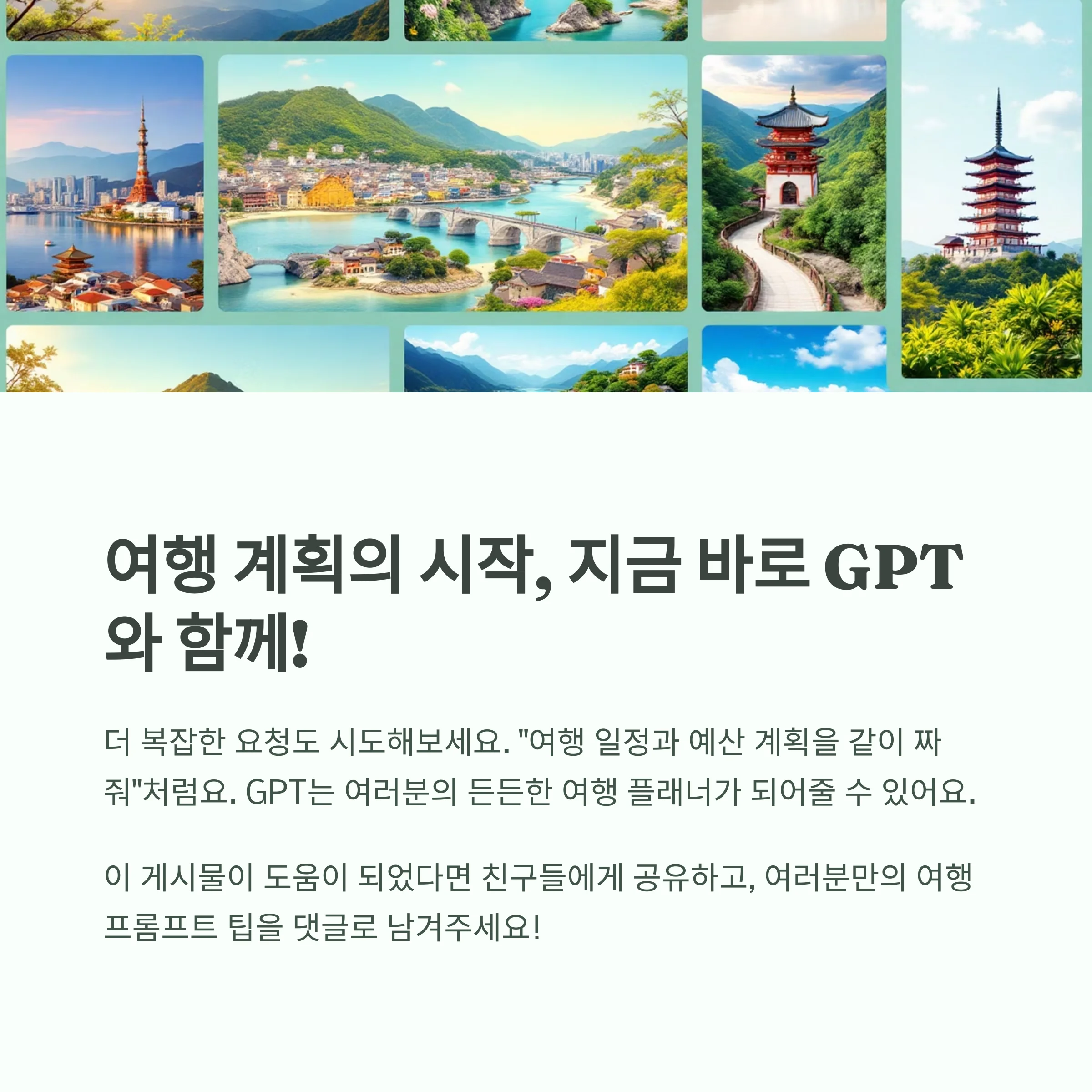다음에는 더 복잡한 요청도 시도해보세요. 예를 들어 “여행 일정과 예산 계획을 같이 짜줘” 같은 식으로요. GPT는 여러분의 든든한 여행 플래너가 되어줄 수 있어요.