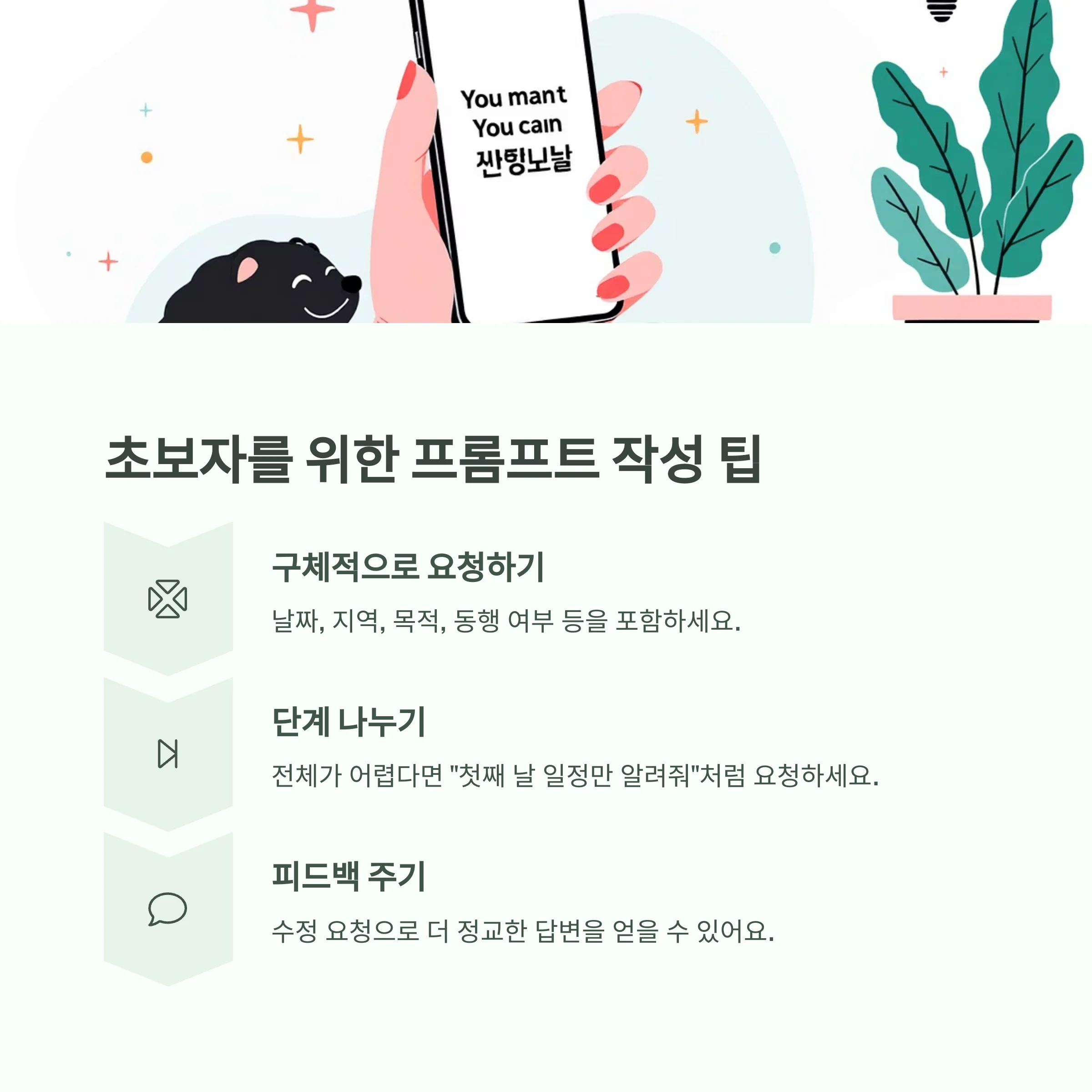 처음엔 어떻게 시작해야 할지 막막하죠? 그래서 제가 몇 가지 프롬프트 작성 요령을 정리해봤어요. 아래 팁들을 참고하면 훨씬 쉽게 원하는 답을 끌어낼 수 있어요.