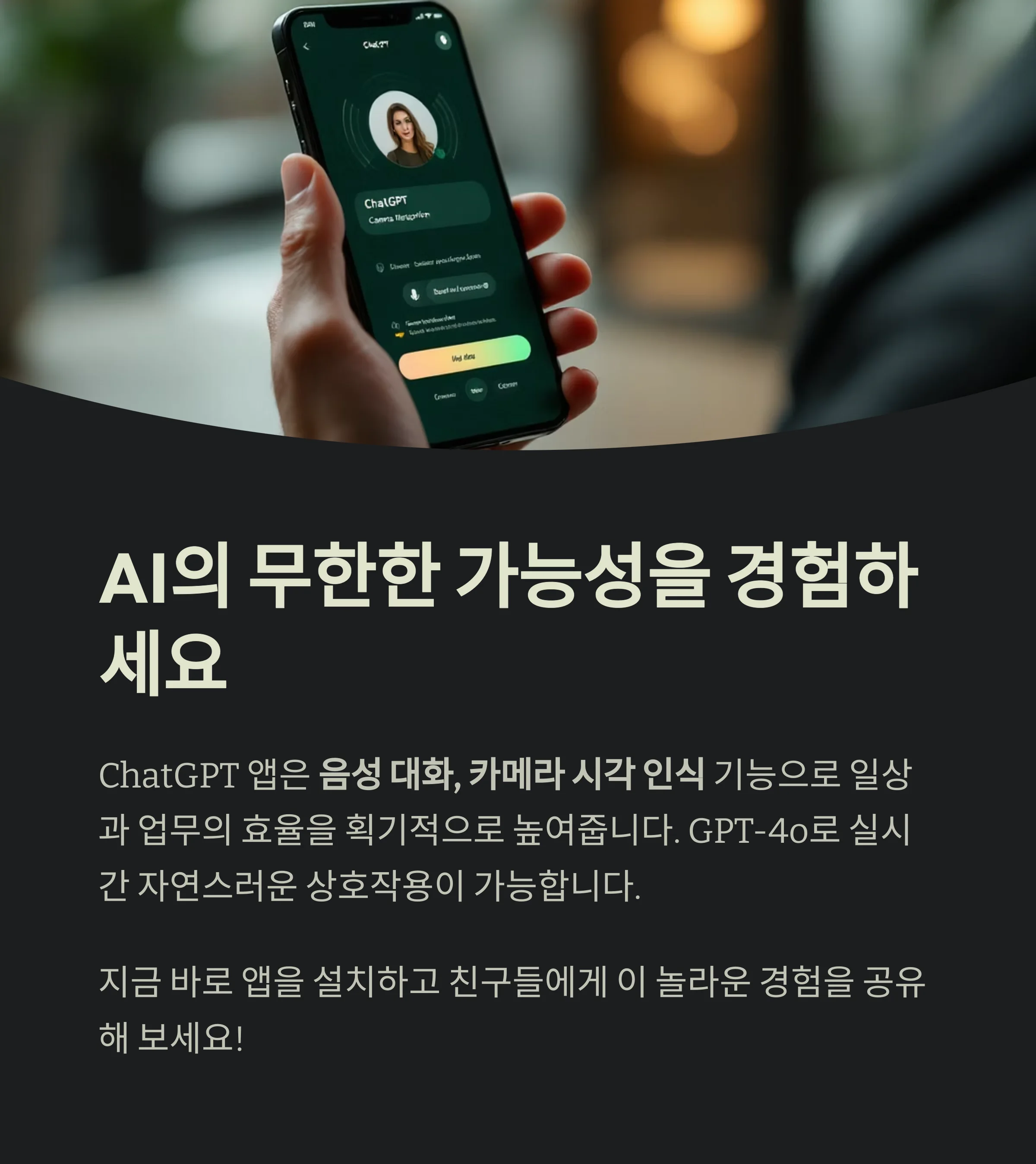 지금 ChatGPT 앱을 설치하고, 음성과 카메라 기능을 체험해 보세요. 새로운 세상이 열립니다!