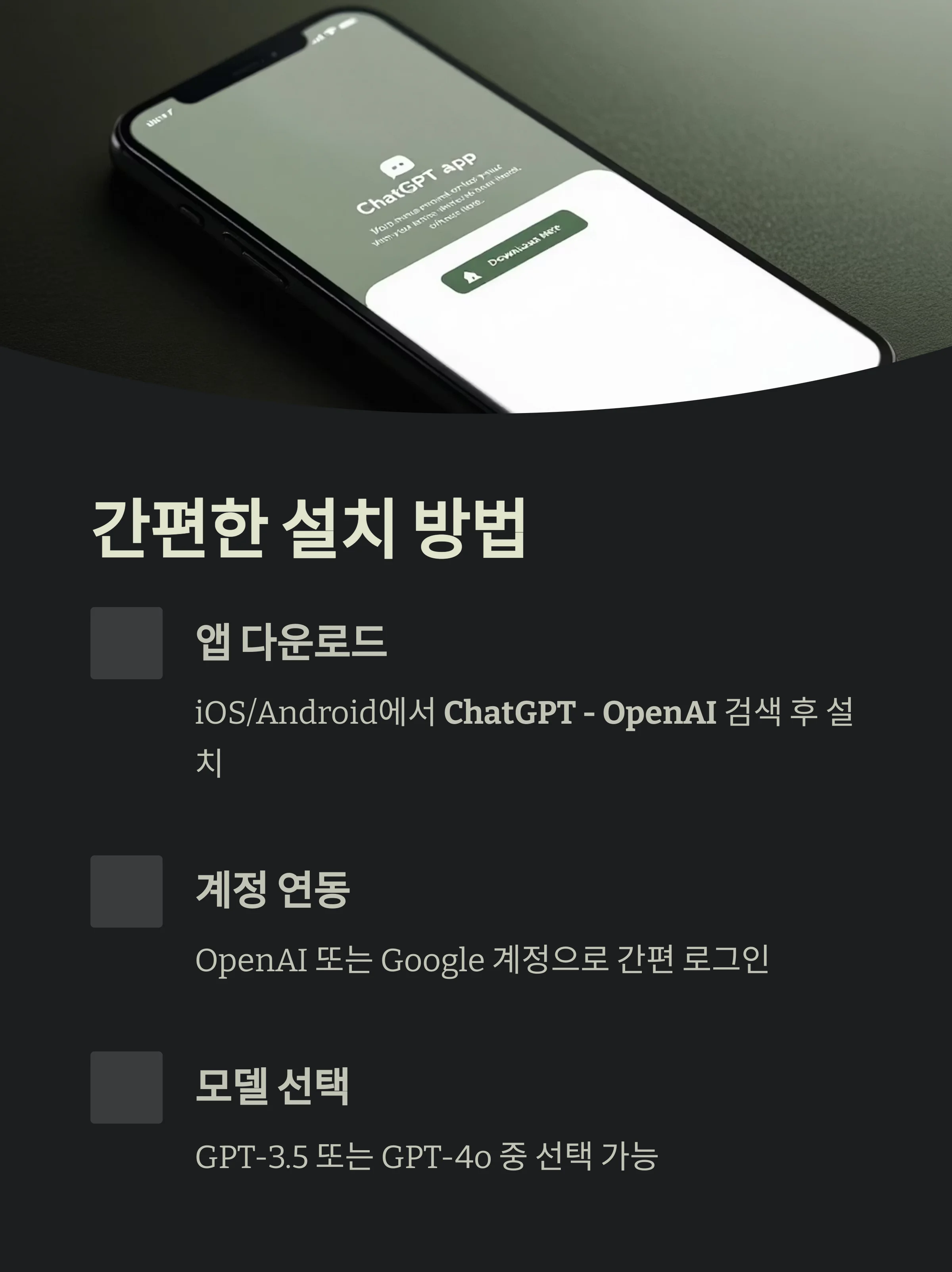 ChatGPT 앱은 iOS와 Android 모두 지원합니다. 앱스토어나 구글플레이에서 "ChatGPT"를 검색하여 설치할 수 있습니다. 로그인 시 OpenAI 계정이나 Google 계정을 사용할 수 있어 간편합니다.