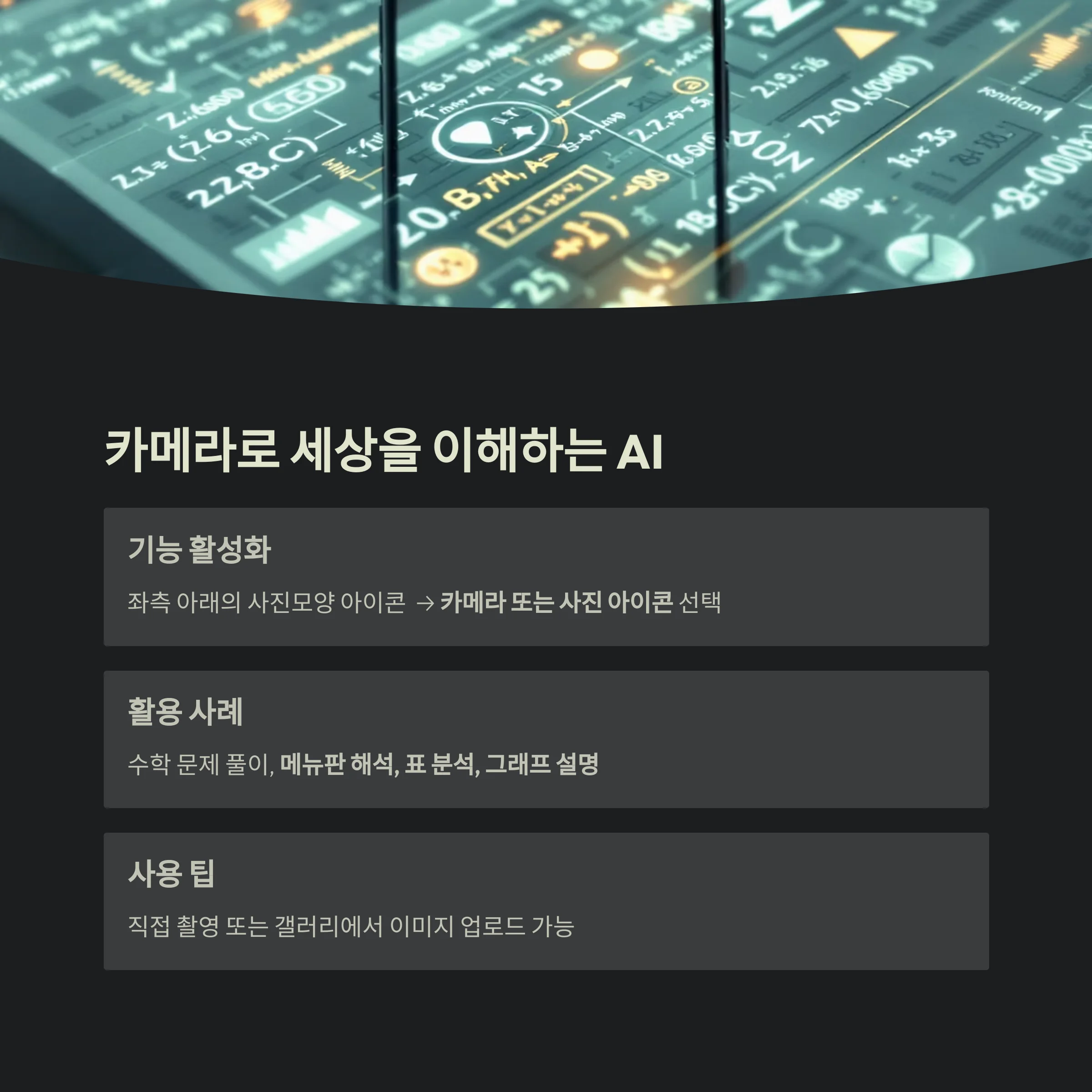 예를 들어 수학 문제를 종이에 써서 보여주면, 풀이 과정을 설명해줍니다. 전자제품 뒷면의 포트 구성이나, 문서의 특정 항목 해석도 가능합니다. 특히 메뉴판 해석, 표 분석, 그래프 설명에 매우 유용합니다.