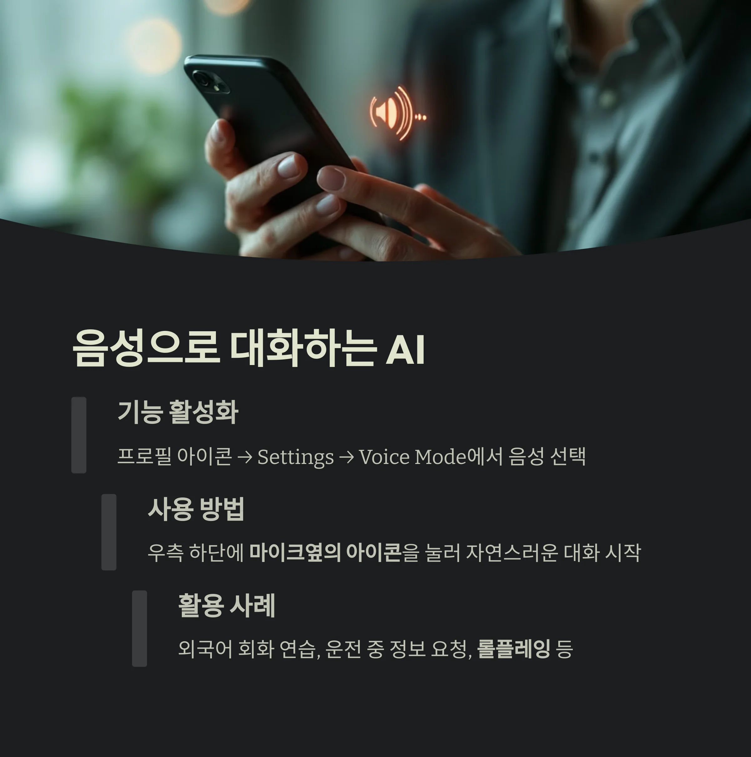 ChatGPT 앱에서 음성 기능을 사용하면, 마치 사람과 대화하듯 AI와 말을 주고받을 수 있습니다. GPT-4o에서는 지연 시간이 거의 없고, 자연스러운 억양까지 갖춘 음성 대화가 가능합니다. 영어, 한국어 등 다국어도 유연하게 지원합니다.